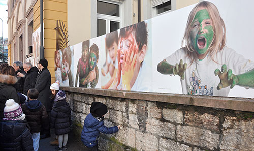 Anche un piccolo gioco con i colori fatto insieme ai bambini della scuola materna Tambosi di Trento, può essere l’occasione per occupare degli spazi urbani, non con della cartellonistica pubblicitaria, ma, come in questo caso, tappezzando i muri esterni dell’asilo, con immagini di quell’umanità che è sinonimo di colletività._Giulio Malfer